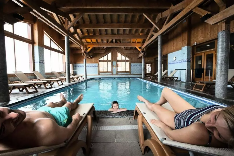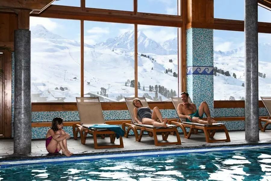 - Sur place : piscine couverte de 72m2 chauffée à 28°C avec vue panoramique sur la montagne, salle de fitness, sauna, hammam.