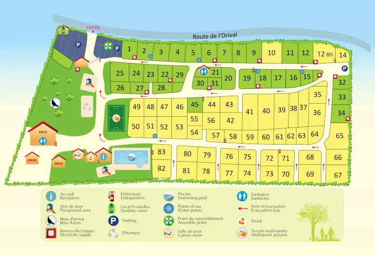 Le camping de l'Orival dispose d'une piscine chauffée, d'un snack-bar, crêperie/pizzéria, d'un terrain multisports, d'un terrain de pétanque et divers équipements pour le plaisirs des petits et des grands.