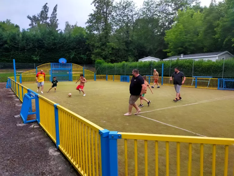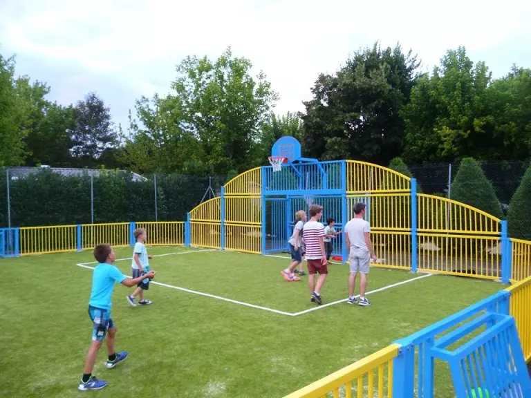 appareils de fitness en plein air, terrain de pétanque avec éclairage, ping pong et court de tennis, espace multisports : volley, foot. Activités ados.