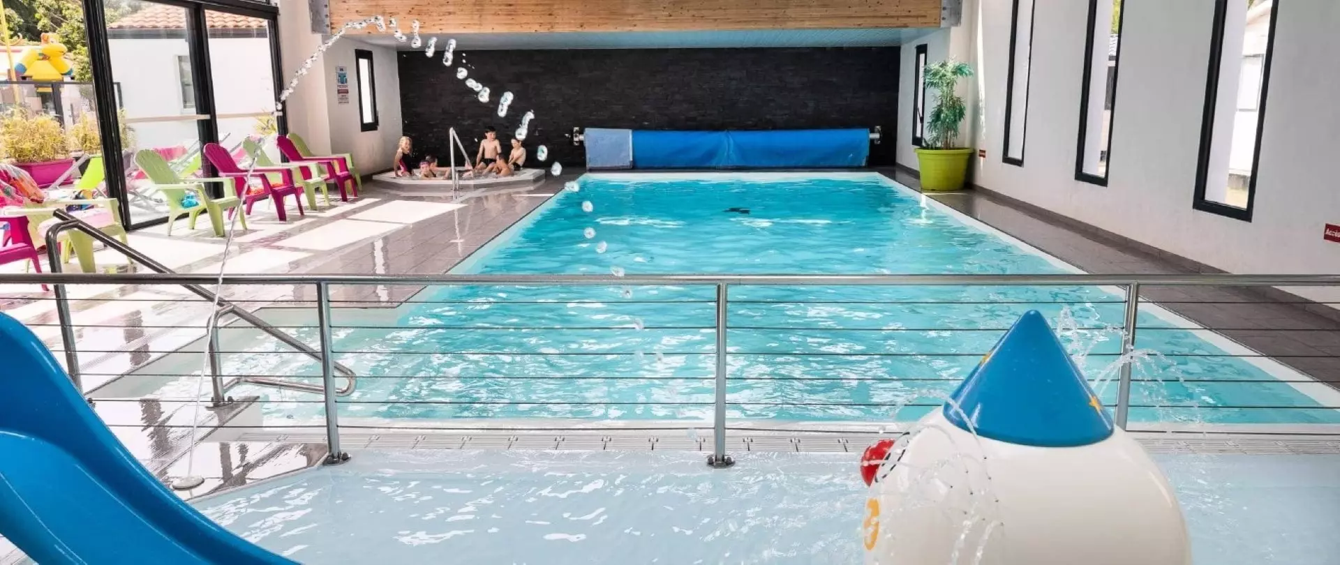 Profitez de l'espace aquatique couvert dès le 1er Avril : piscine couverte avec SPA et pataugeoire ludique. Au 1er Mai, détendez-vous dans la piscine extérieure avec son toboggan aquatique et pataugeoire.