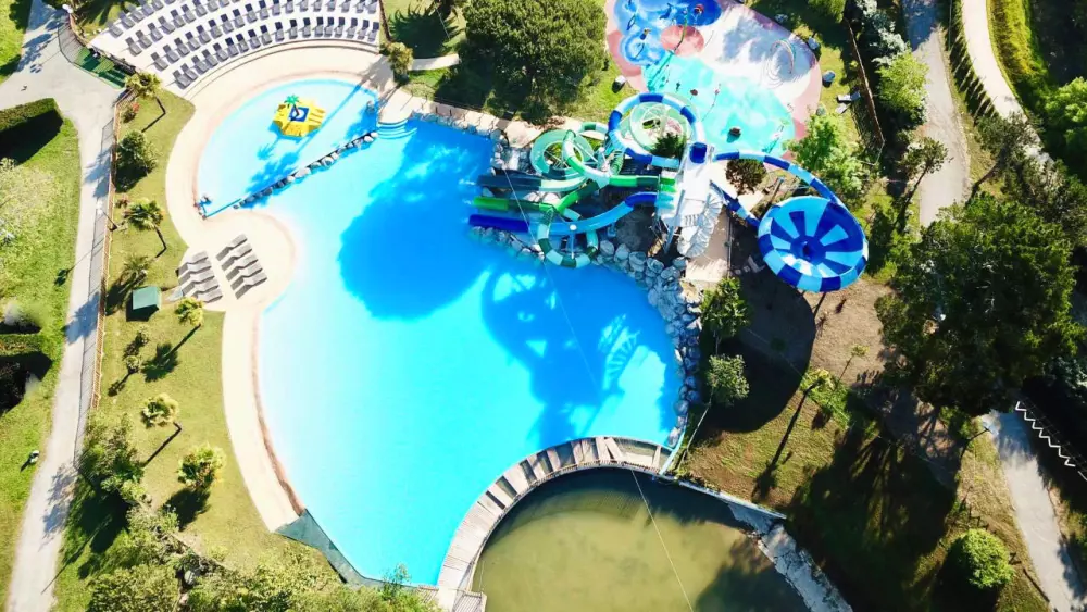 - Grand complexe aquatique extérieur avec piscine, pataugeoire et toboggans (secteur Sud) :