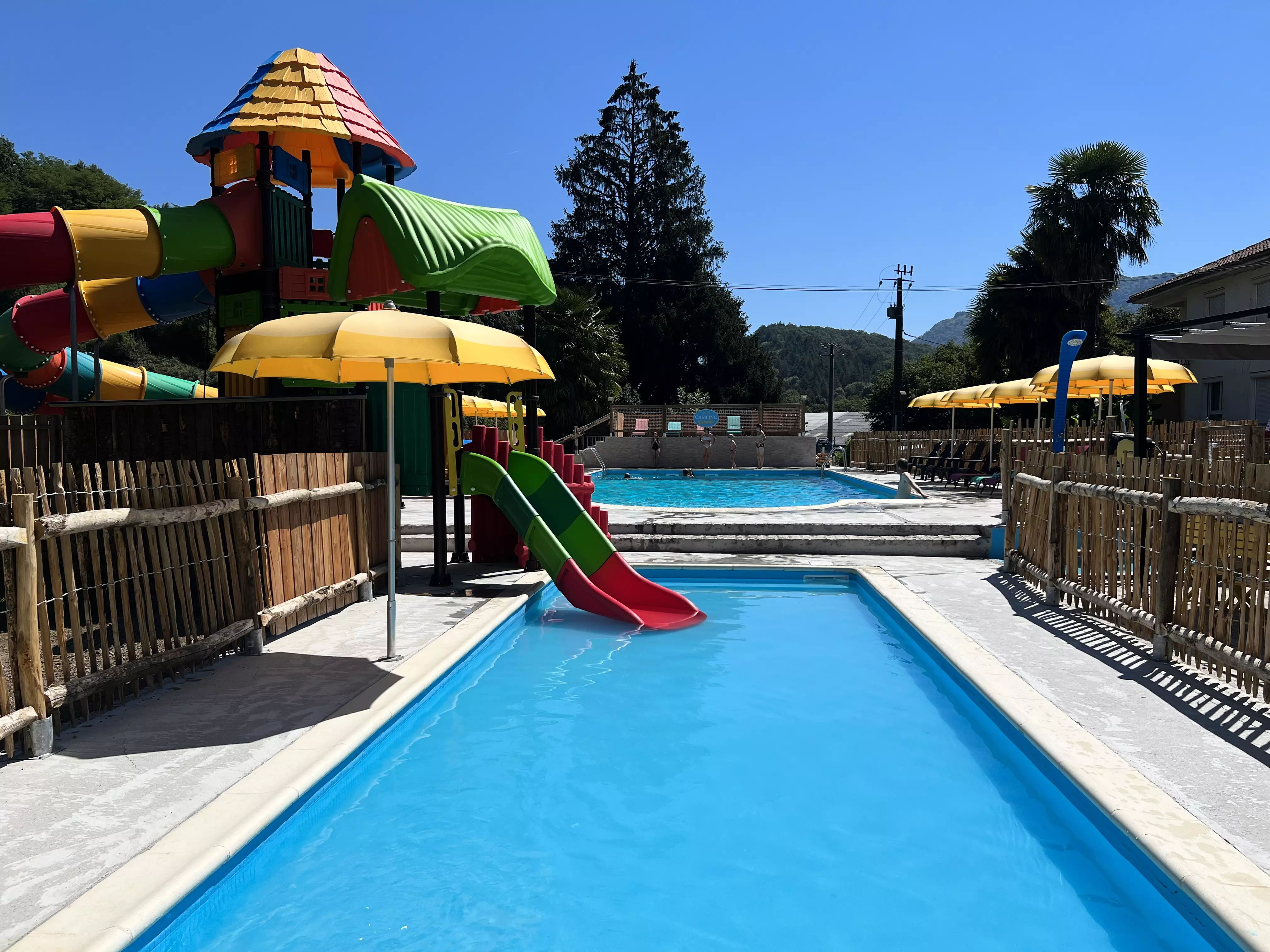 Pour piquer une tête dans la piscine et vous rafraîchir, le camping vous propose un grand bassin dans lequel vous serez en mesure de vous amuser avec vos proches et vos amis. Pour les plus petits vacanciers, une pataugeoire est disponible pour tremper les pieds dans l'eau et vous amuser avec vos enfants. Le parc aquatique ne s'arrête pas ici : Un coin plage aménagé avec du sable autour du bar pour profiter des services du bar, restaurant ou du glacier pendant que les petits font des châteaux de sable dans leur petit coin réservé.