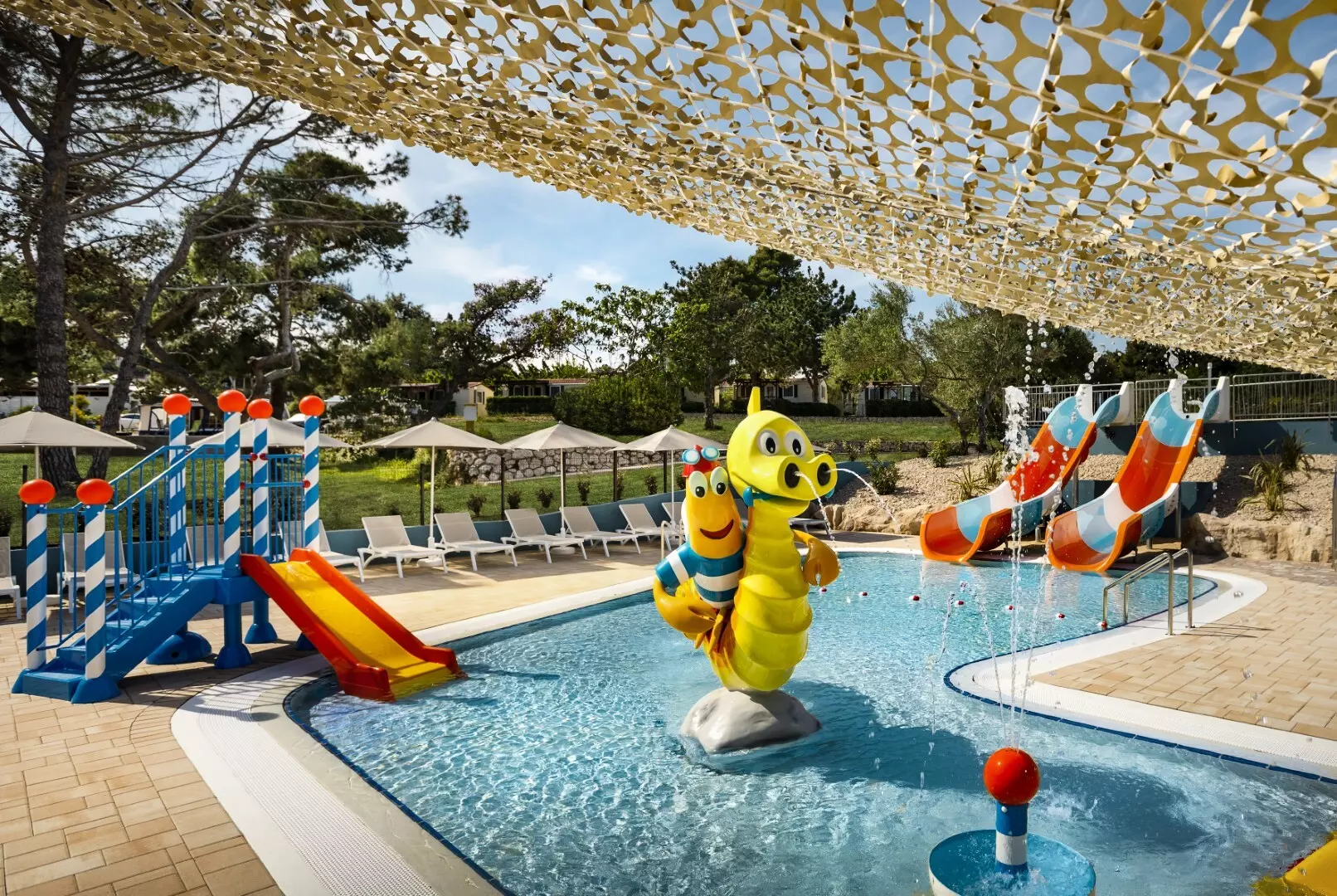 En dehors de la plage, une élégante piscine extérieure vous attend pour un moment de détente, tandis que vos enfants peuvent s'amuser dans le parc aquatique réservé aux plus jeunes, équipé de toboggans et d'arroseurs.