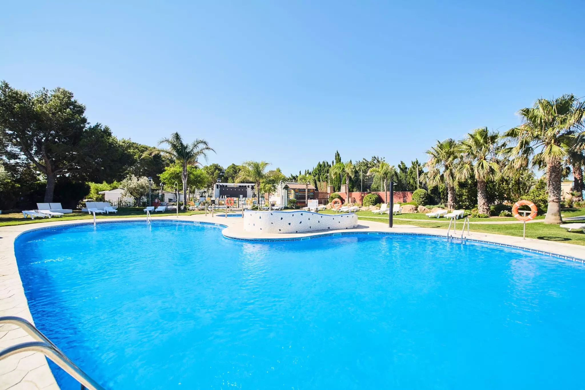 Deux piscines extérieures (adultes + enfants), dont une avec jacuzzi à bulles et jets relaxants, entourées de transats et solarium. Spa & wellness en plein air, jacuzzis, espace fitness extérieur : relaxation et bien-être garantis.