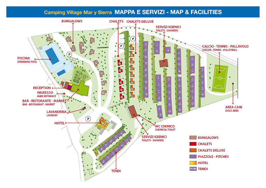 réception, restaurant, pizzeria, snack-bar, plats à emporter, bar, terrasse, deux piscines, transats et parasols, sauveteur, parking gratuit, borne de recharge pour voitures électriques, service camping-car, aire de promenade pour chiens, WiFi gratuit, enregistrement en ligne, yoga, animations (juillet et août).