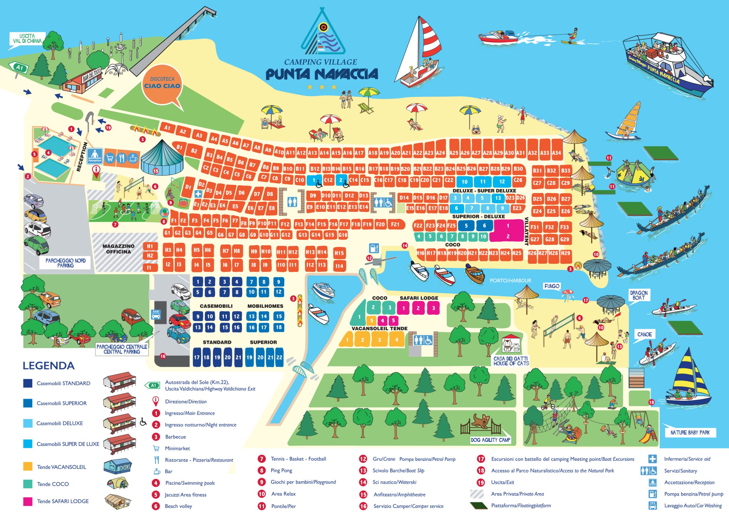 Thanks to its ideal location, the Camping Village Punta Navaccia is a perfect base to visit famous art and cultural cities such as Assisi, Perugia, Rome, Florence and Siena. From the campsite, guests can explore nature trails by bike, on foot or on horseback, and join food and wine tours with tastings of local wines and olive oils.