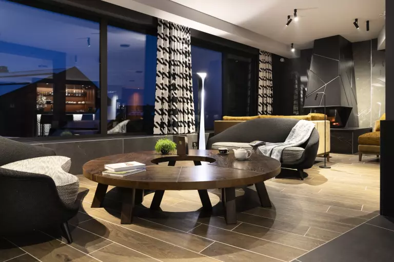 Après une journée de grand air, le salon de réception avec sa cheminée centrale, son espace bar lounge s'inscrit en prélude à des instants de complicité en famille ou entre amis !