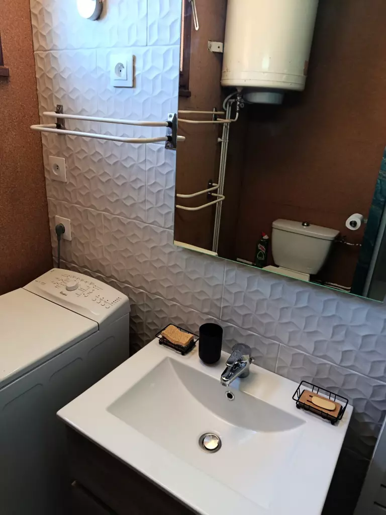 Salle de bains : bac à douche, WC .lave linge