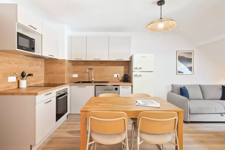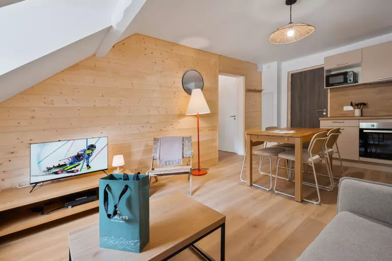 L'Ecrin 25, niché au deuxième étage d'une résidence entièrement refaite à neuf, est un cocon chaleureux conçu pour accueillir confortablement 2 adultes et 2 enfants. Son emplacement stratégique, à proximité immédiate du village et avec un arrêt de navette situé en face de la résidence, garantit un accès pratique à toutes les commodités.