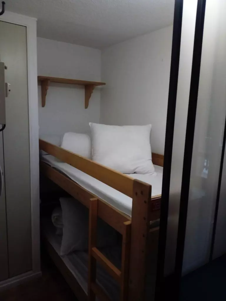 Cabine (séparée de l'entrée par une porte coulissante/ 3m²) : 2 lits superposés (2x 90x190cm)