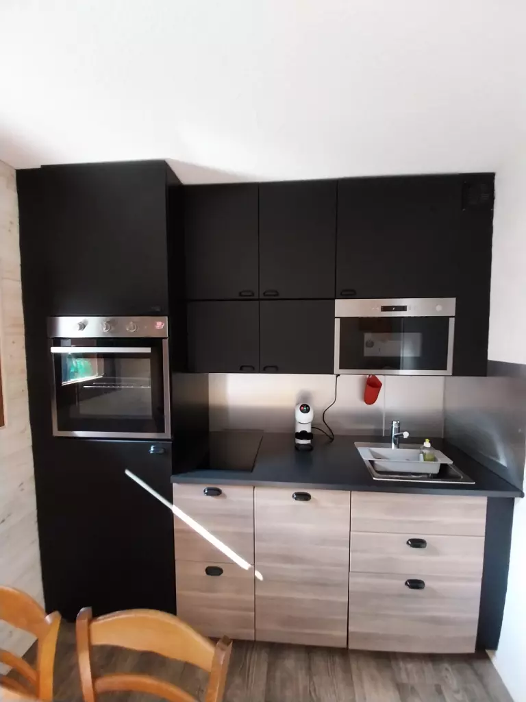 Coin cuisine : four, micro-ondes, réfrigérateur/congélateur, 2 plaques induction, lave-vaisselle