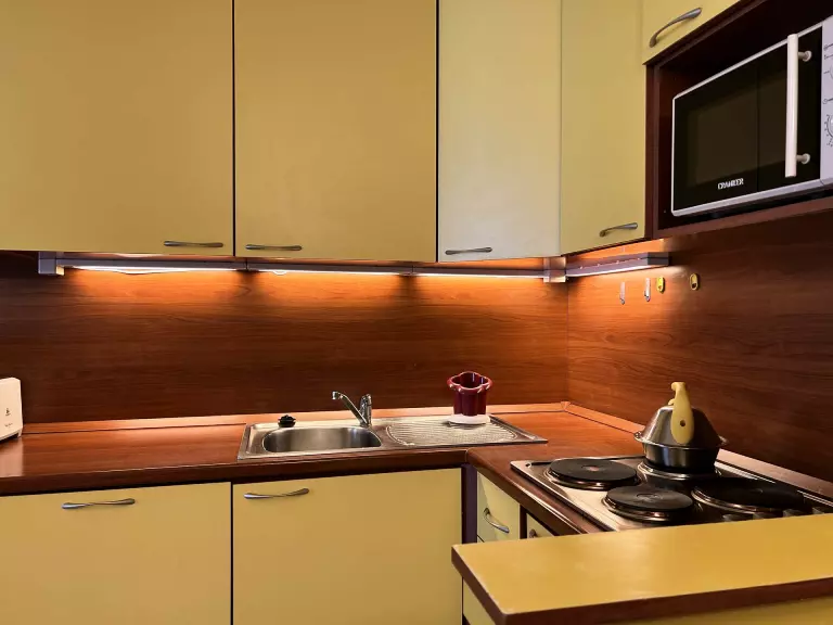 - La cuisine contient : 4 plaques électriques, réfrigérateur, lave-vaisselle, micro-ondes, cafetière, grille-pain.
