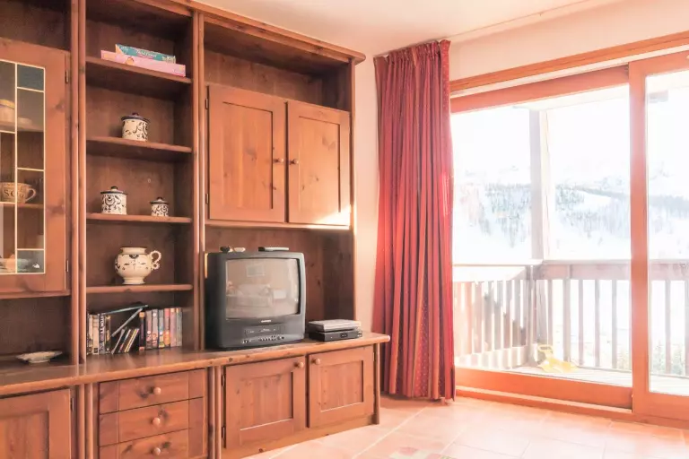 Ce spacieux appartement dispose, d'un grand séjour avec vue panoramique sur la station et les pistes, d'un canapé lit convertible
