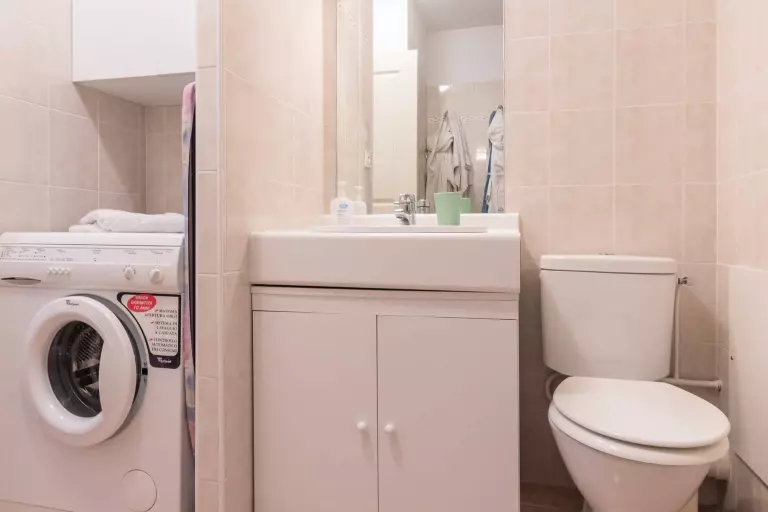 D'une salle d'eau avec machine à laver et WC.