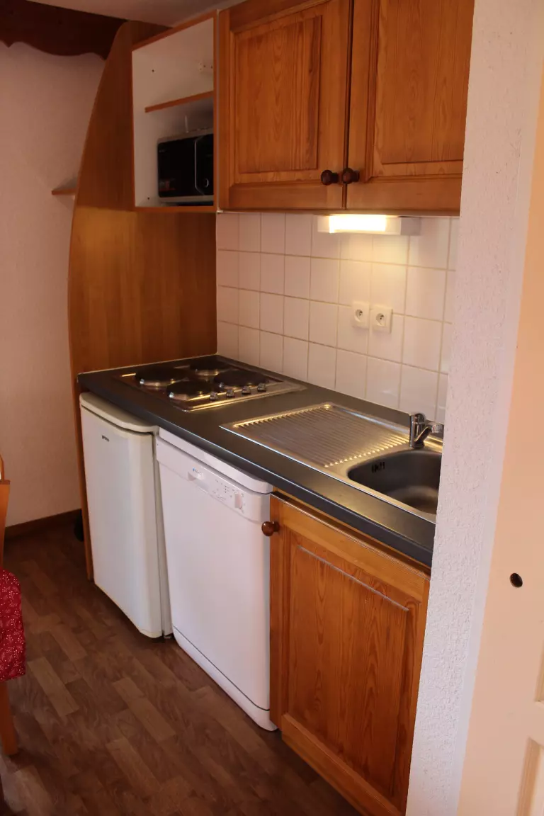 Kitchenette entièrement équipée. Lave vaisselle, micro-ondes, cafetière électrique.