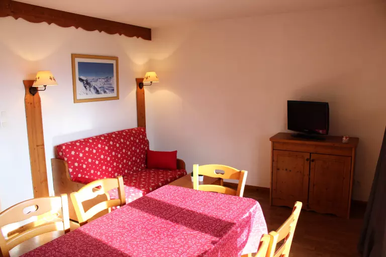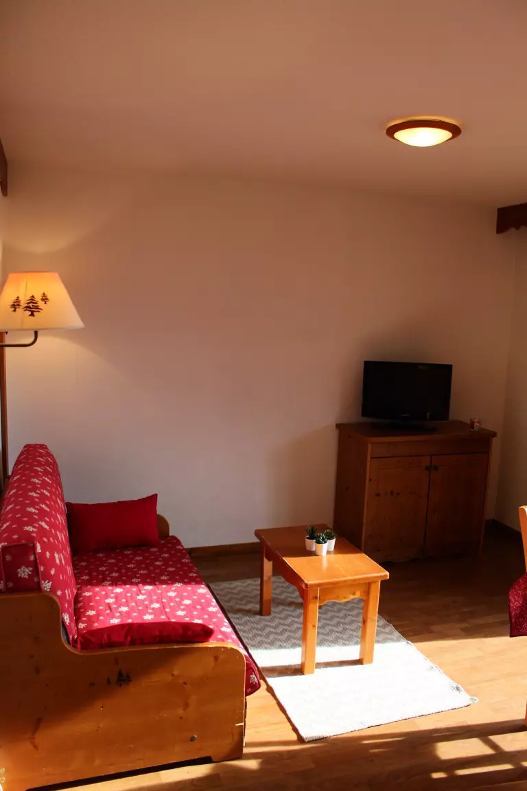 Séjour avec canapé lit. 1 chambre avec lit 2 personnes. 1 cabine avec lit superposé. Télévision comprise