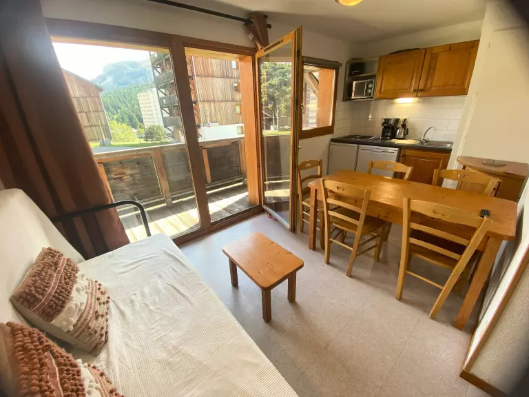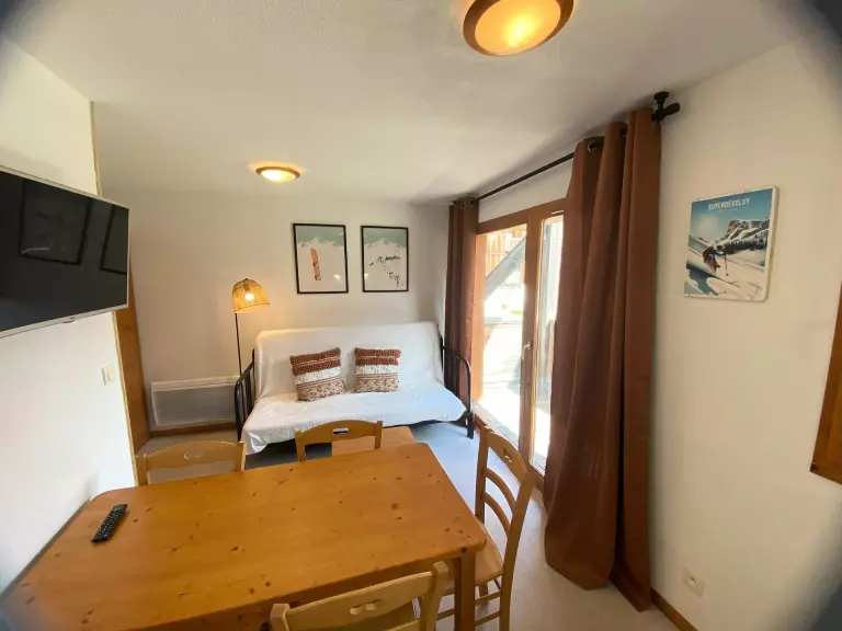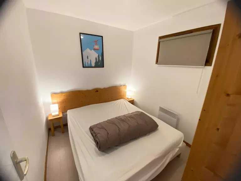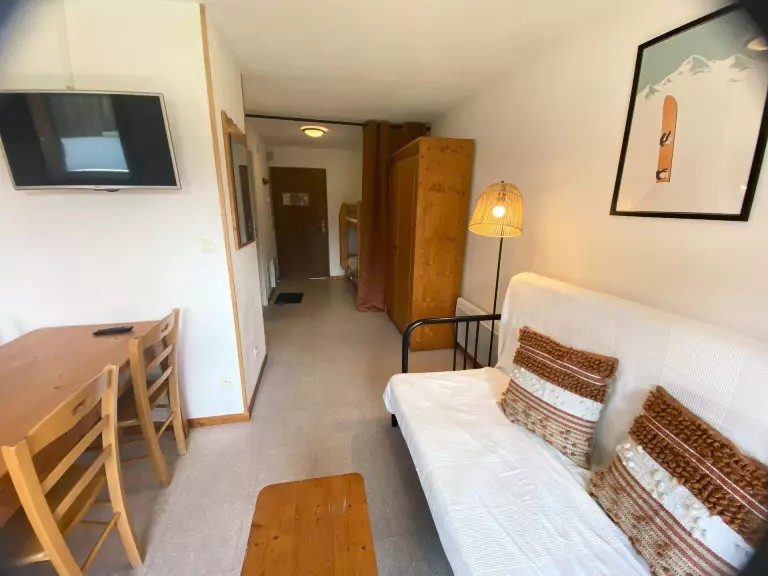Séjour avec canapé lit. Coin montagne avec 2 lits superposés. Chambre avec 1 double. Appartement équipé de couettes (possibilité de location de housse de couette).
