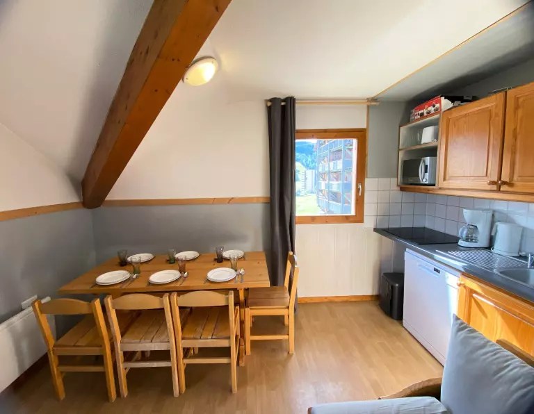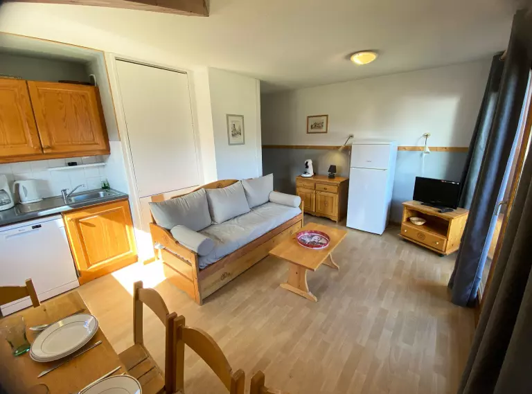 Séjour avec Kitchenette équipée, lave vaisselle, 4 plaques chauffantes, micro-ondes, cafetière filtre, grille-pain, bouilloire électrique, appareil à Raclette.
