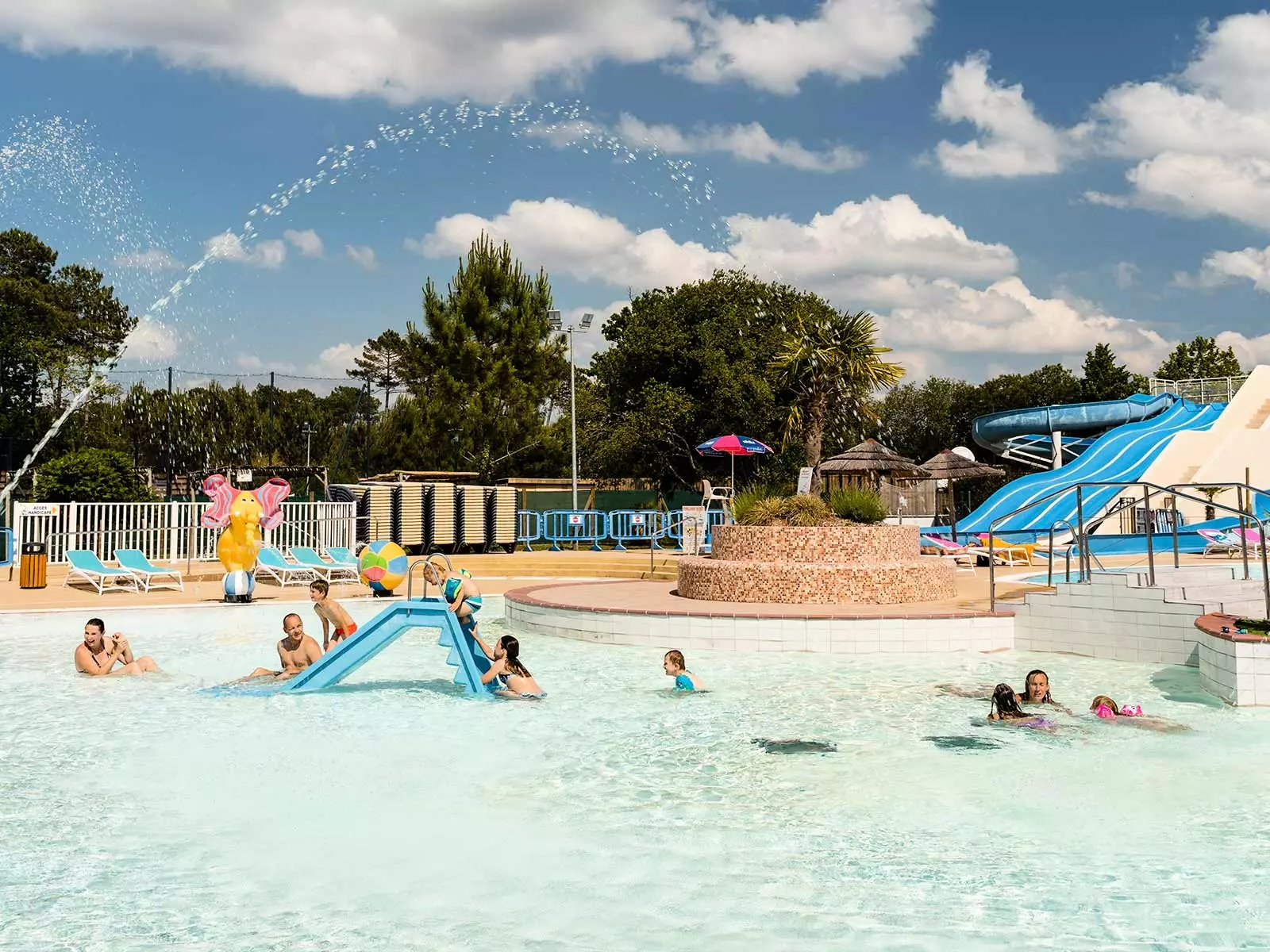 Complexe aquatique surveillé en permanence par des maîtres nageurs et surveillants de baignade qualifiés, Piscine extérieure aménagée: 2 bassins**, Grande pataugeoire, 4 pistes de glisse et toboggan (de mai à septembre**), Piscine couverte (eau chauffée), Champignon (cascade d'eau), bain à bulles, Aquagym °